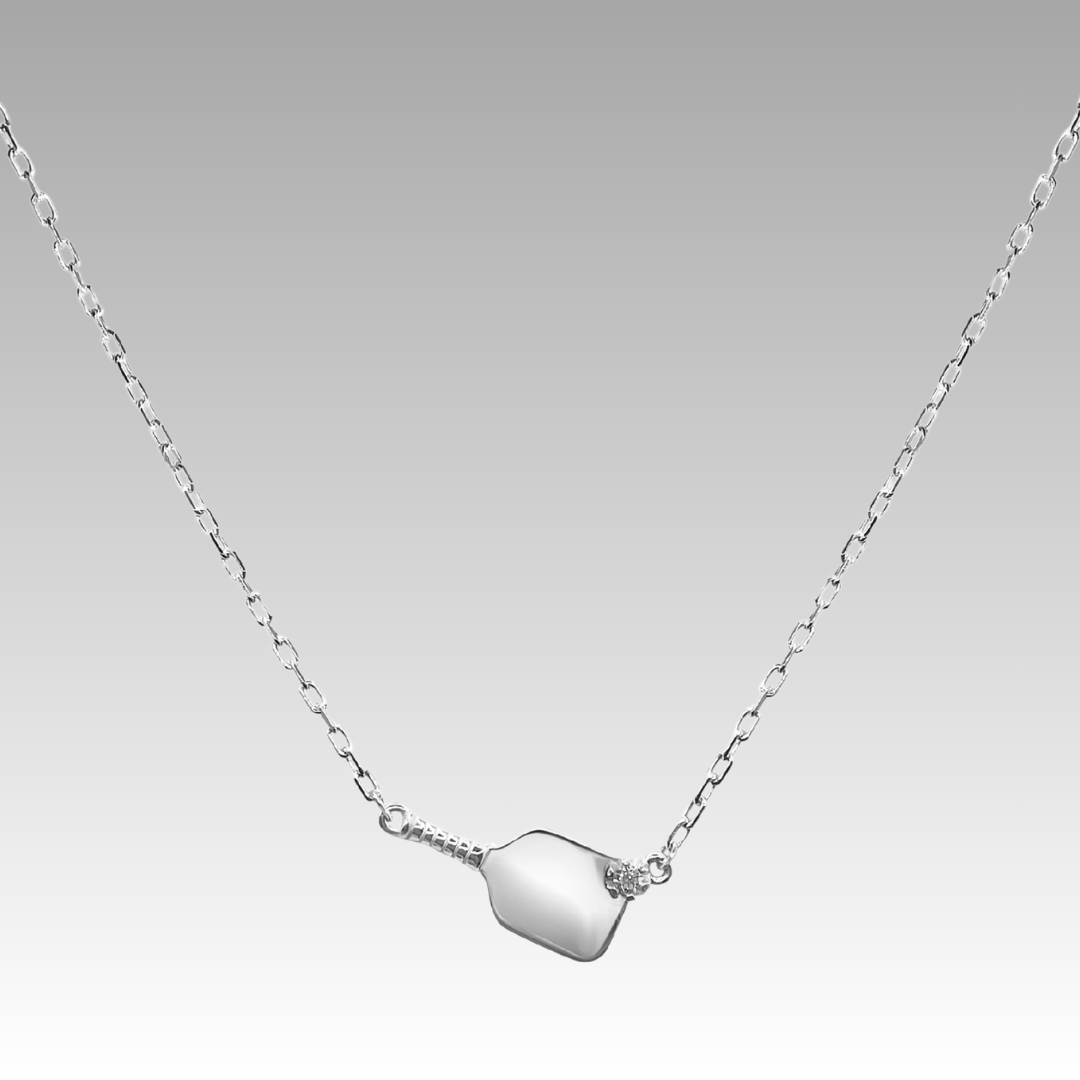 Custom designed sterling silver and diamond pickleball necklace on 18" paperclip chain